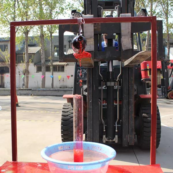 叉車(chē)倒紅酒,叉車(chē)貨叉尖端裝置一根前端稍彎曲鐵針,用鐵針頂住紅酒瓶底部,參賽選手需要駕駛叉車(chē)將紅酒平穩倒入杯中。主要比拼選手掌握叉車(chē)的平穩性和精細度。
